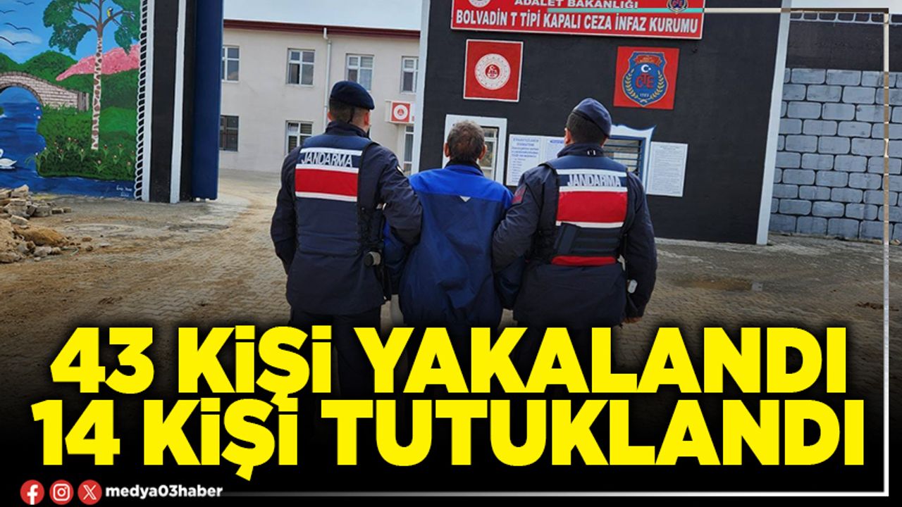 Afyonkarahisar İl Jandarma Komutanlığı ekiplerince son bir hafta içerisinde aranan şahıslara yönelik yapılan denetimlerde yağma suçundan (1), öldürme suçundan (1), dolandırıcılık suçundan (3), hırsızlık suçundan (6), kaçakçılık suçundan (2), narkotik suçlardan (2), siber suçlardan (6) ve diğer suçlardan (22) şahıs olmak üzere toplam (43) şahsı yakaladı.