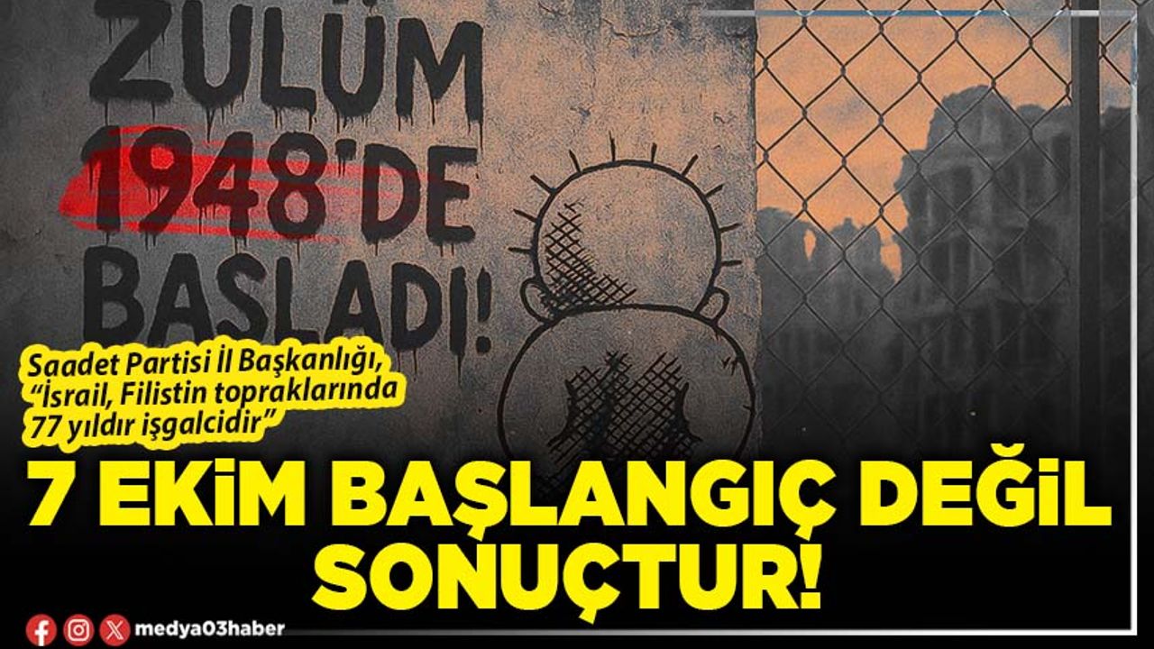 Konuyla ilgili Saadet Partisi Afyonkarahisar İl Başkanlığı’ndan yapılan açıklamada şu ifadelere yer verildi: “7 Ekim Başlangıç Değil, Sonuçtur. Bir milletin ambargoya, açlığa, sürgüne, katliama, soykırıma karşı isyanıdır. İsrail, Filistin topraklarında 77 yıldır işgalcidir. 77 yıldır çocukları, kadınları, doktorları, gazetecileri, akademisyenleri öldürmeye; hastaneleri, ambulansları vurmaya; yerinden yurdundan edilmiş insanları kamplarda bombalamaya devam ediyor.