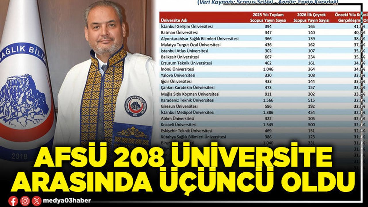 Türkiye Bilimler Akademisi (TÜBA) Genç Akademi Üyesi Prof. Dr. Engin Karadağ tarafından, Elsevier’in bilimsel analiz platformu SciVal verilerine dayanarak hazırlanan “Üniversitelerin Scopus Yayın Üretim Eğilimleri: 2025–2026 İlk Çeyrek Analizi” raporuna göre AFSÜ, 2026’nın ilk çeyreğinde, 2025’in aynı dönemine kıyasla akademik yayın sayısını %38 oranında artırarak Türkiye’deki 208 üniversite arasında 3. sıraya yükseldi.
