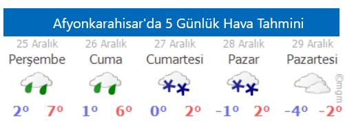 Edinilen bilgilere göre; Afyonkarahisar’da Perşembe ve Cuma günü sağanak yağmur etkili olurken, Cumartesi ve Pazar günü ise hafif kar yağışı etkisini gösterecek. Öte yandan hava sıcaklıkları da hissedilir derecede düşecek.