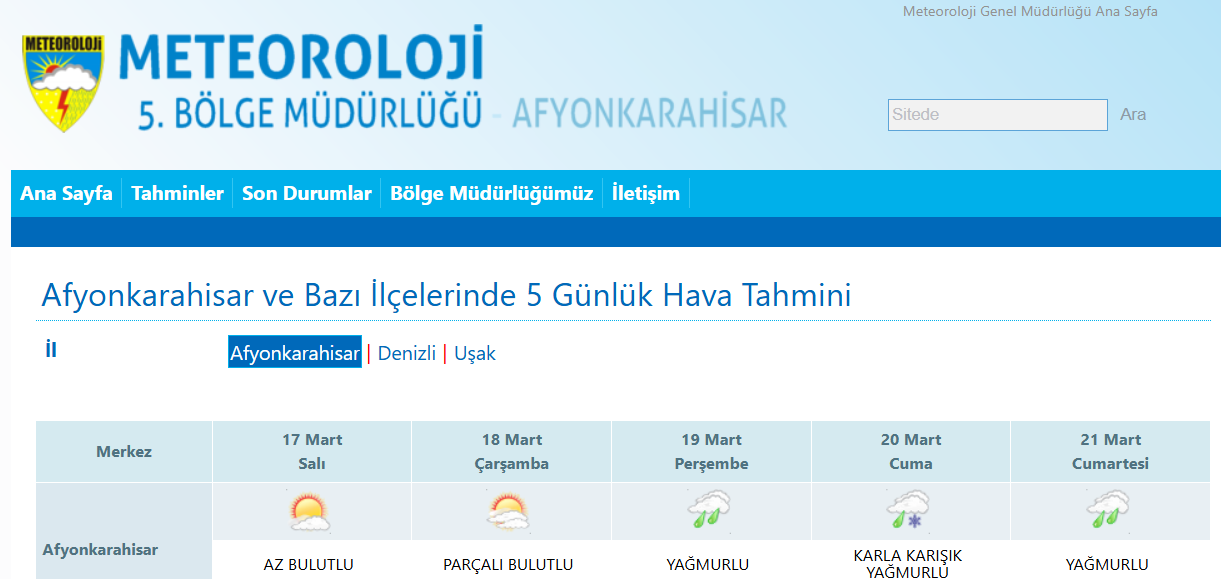 Meteoroloji Genel Müdürlüğü 5. Bölge Müdürlüğü’nün paylaştığı verilere göre Afyonkarahisar’da bayram yağmurlu ve karla karışık yağmurlu geçecek.