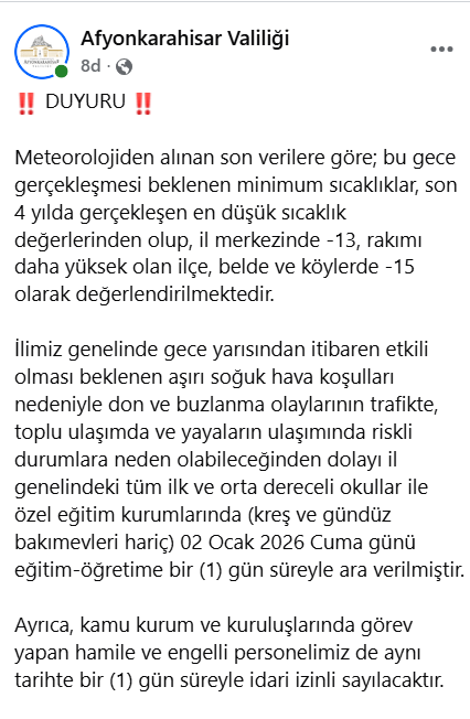 İlimiz genelinde gece yarısından itibaren etkili olması beklenen aşırı soğuk hava koşulları nedeniyle don ve buzlanma olaylarının trafikte, toplu ulaşımda ve yayaların ulaşımında riskli durumlara neden olabileceğinden dolayı il genelindeki tüm ilk ve orta dereceli okullar ile özel eğitim kurumlarında (kreş ve gündüz bakımevleri hariç) 02 Ocak 2026 Cuma günü eğitim-öğretime bir (1) gün süreyle ara verilmiştir.
