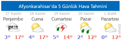 Meteoroloji 5. Bölge Müdürlüğü’nden alınan verilere göre; Afyonkarahisar'da Perşembe günü (yarın) puslu hava etkili olurken, Cumartesi günü gökgürültülü sağanak yağış, Pazar günü de sağanak yağış etkili olacak.