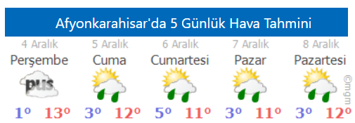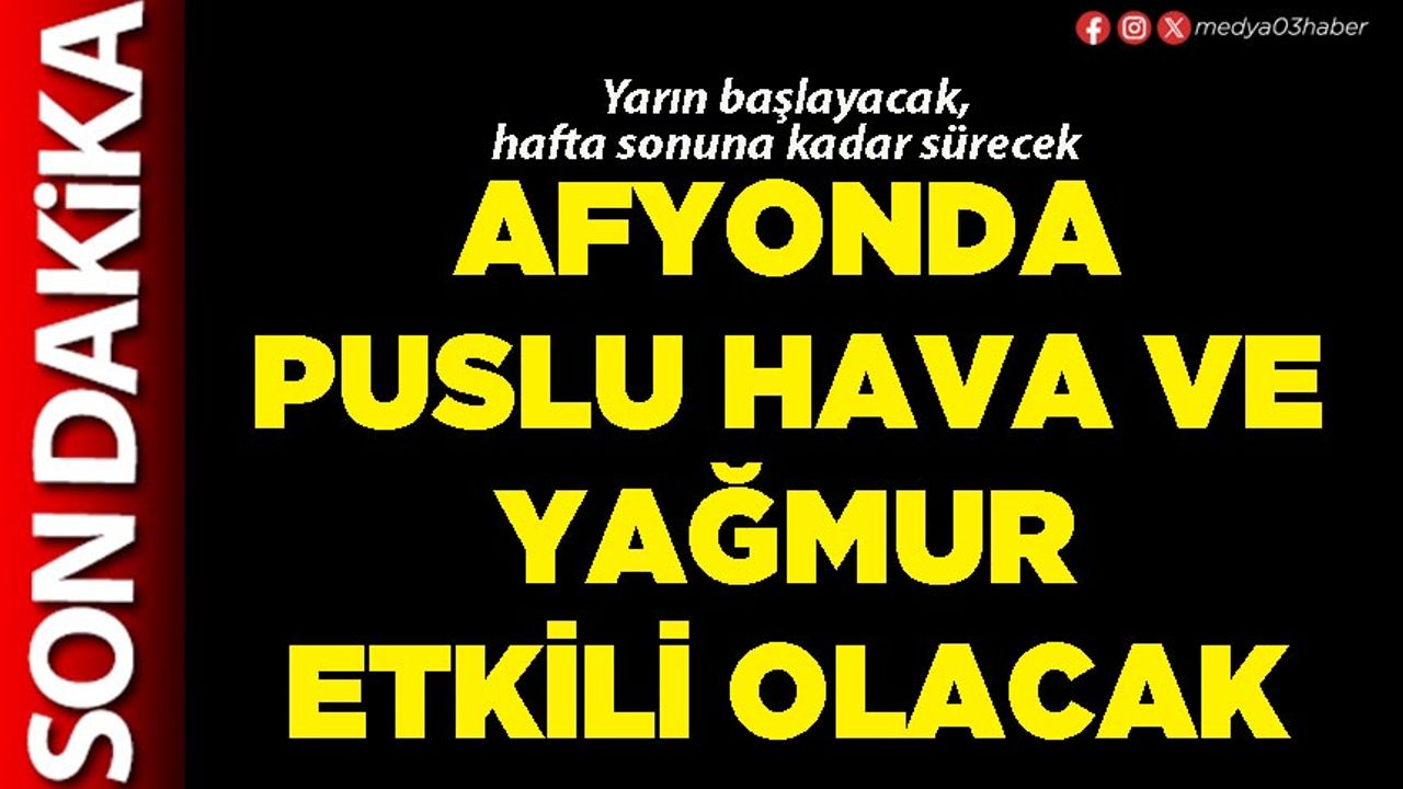 Meteoroloji 5. Bölge Müdürlüğü Afyonkarahisar için puslu hava ve yağışlı hava uyarısında bulundu. Edinilen bilgilere göre; ilimiz yarından (Perşembe) itibaren puslu havanın etkisi altına girerken, Cuma, Cumartesi ve Pazar günü de yağışlı hava etkili olacak. Yetkililer özellikle sürücüleri puslu hava nedeniyle dikkatli olmaları konusunda uyardı.