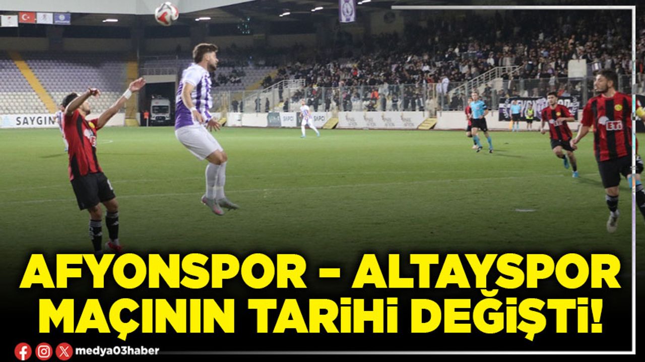 TFF, Afyonspor ile Altayspor arasında oynanacak karşılaşmanın gününü değiştirdi. Afyonspor Yönetiminin talebini değerlendiren TFF değişikliğe gitti. Buna göre Afyonspor ile Altayspor arasında oynanacak karşılaşma Pazar günü Zafer Stadyumu’nda Saat 17.00’de başlayacak.