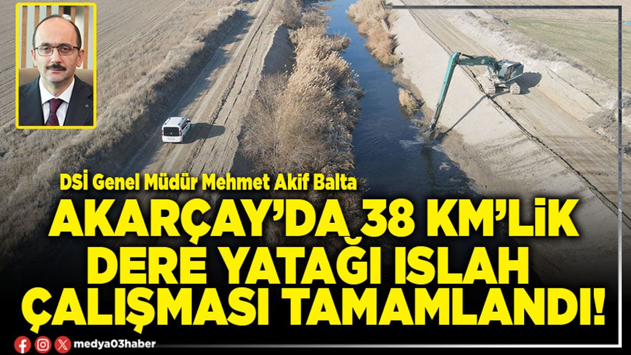 DSİ Genel Müdür Mehmet Akif Balta Akarçay’da devam eden dere yatağı ıslah çalışmalarıyla ilgili açıklama yaptı. Balta, “2010 yılında yapımına başlanıp 2012 yılında hizmete sunulan “Afyonkarahisar Merkez Akarçay Islahı” projesidir. Proje kapsamında Afyonkarahisar Şehir Merkezinde Akarçay’ın 4503 m’ik kısmında, 4384 m çift taraflı betonarme kanal, 3 adet 3 gözlü kemer köprü, 1 adet ızgara tesisi ve 1 adet taşkın önleyici tesis tamamlanarak hizmete alınmıştır. Yapılan proje basit bir dere ıslahı olmayıp Afyonkarahisar’ın adeta vitrini olmuştur.”
