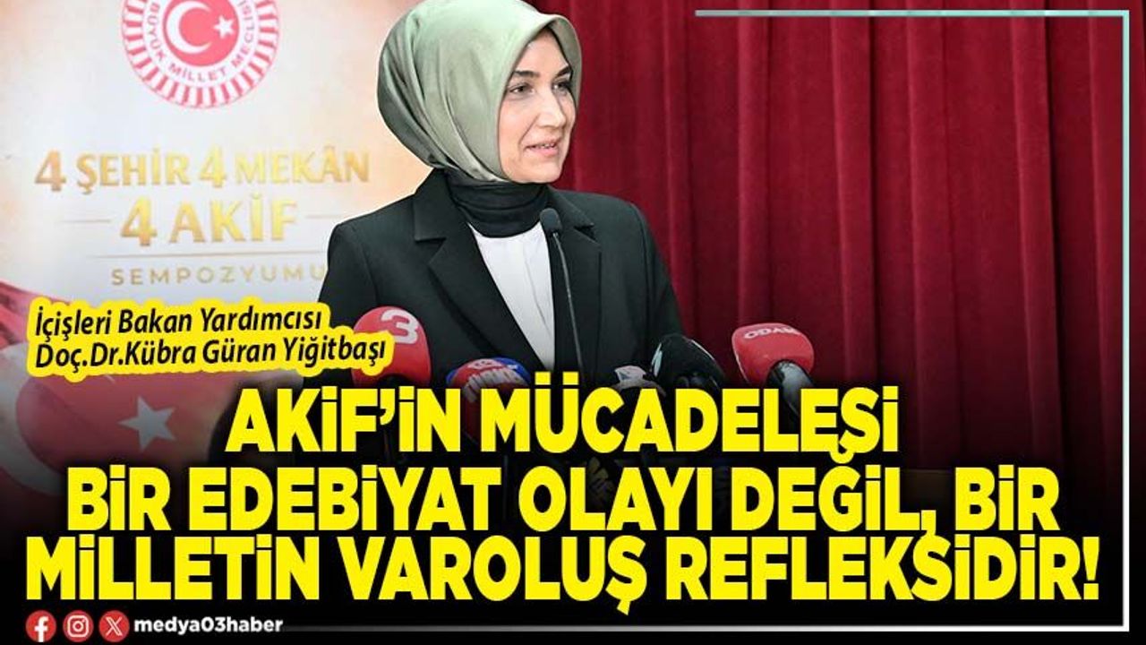 İçişleri Bakan Yardımcısı Doç. Dr. Kübra Güran Yiğitbaşı, Akif’in mücadelesinin sadece bir edebiyat olayı değil, bir milletin varoluş refleksi olduğunu belirtti. Yiğitbaşı, sempozyumun geçmişe yönelik bir anma etkinliğinin çok ötesinde olduğunu belirterek, Mehmet Akif Ersoy’un fikir dünyasının esaret, vahdet, cesaret ve azimet duraklarıyla yeniden keşfedildiği ve sarsılmaz karakterini bugüne taşıdığı bir istikbal yolculuğu olduğunu ifade etti.
