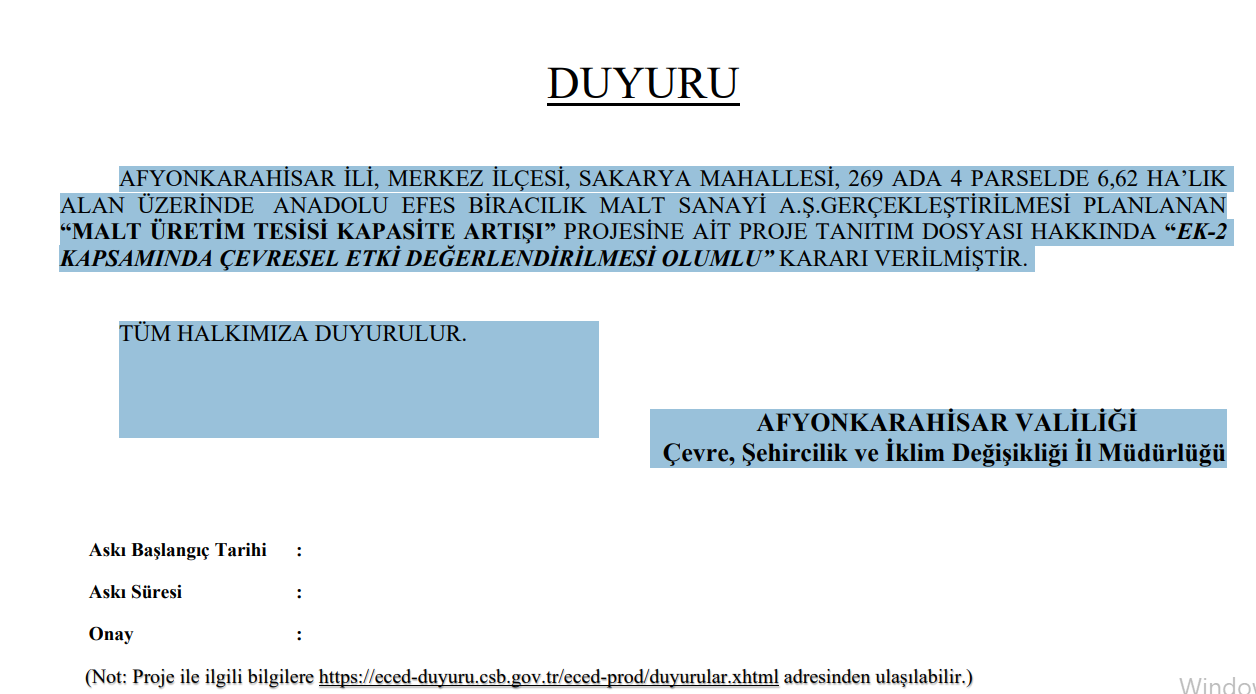 Afyonkarahisar Valiliği Çevre, Şihircilik ve İklim Değişikliği İl Müdürlüğü’nün konuyla ilgili aldığı karar şöyle: “Afyonkarahisar İli, Merkez İlçesi, Sakarya Mahallesi, 269 ada 4 parselde 6,62 ha’lık alan üzerinde Anadolu Efes Biracılık Malt Sanayi A.Ş. gerçekleştirilmesi planlanan “malt üretim tesisi kapasite artışı” projesine ait proje tanıtım dosyası hakkında “ek-2 kapsamında çevresel etki değerlendirilmesi olumlu” kararı verilmiştir.” ifadelerine yer verildi.