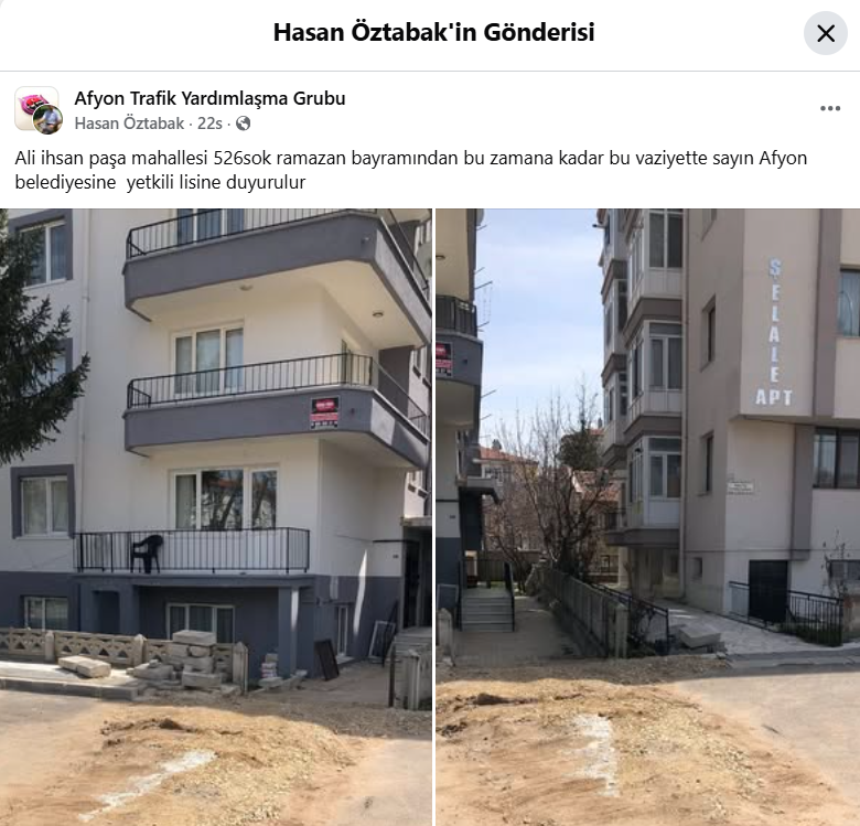 Bir vatandaş Ali İhsan Paşa Mahallesinden paylaştığı fotoğrafta, “Ali İhsan Paşa Mahallesi 526 Sokak, Ramazan bayramından bu zamana kadar bu vaziyette. Sayın Afyon Belediyesine yetkili lisine duyurulur.”