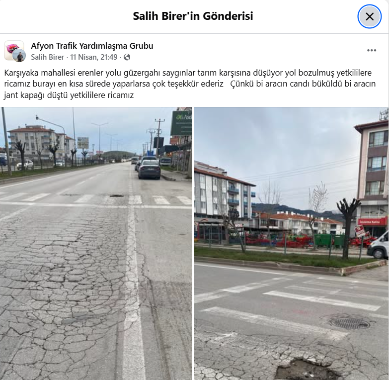 Afyon Trafik Yardımlaşma Grubu sosyal medya hesabından vatandaşlar yarım bırakılan ve bazı noktalarda oluşan derin çukurların yer aldığı fotoğrafları paylaşarak Afyonkarahisar Belediyesi ekiplerine seslerini duyurmaya çalışıyor.