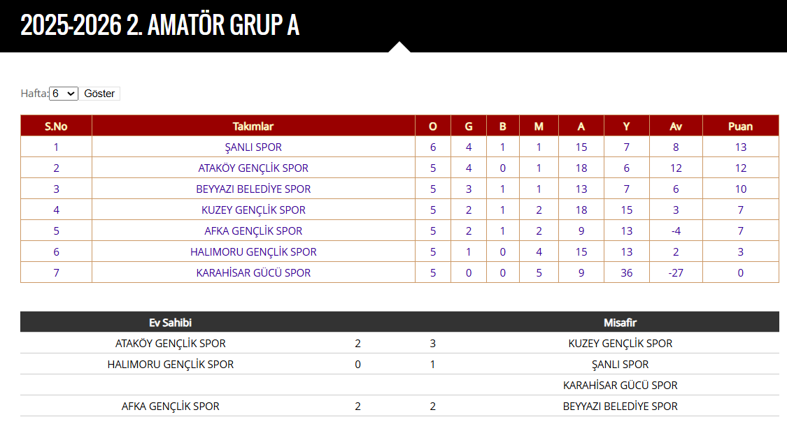 Afyonkarahisar 2. Amatör Lig A grubunda dün 3 karşılaşma oynandı. Futbolseverlerin 10 gol izlediği haftada haftaya namağlup lider olarak giren Ataköy Gençlikspor Kuzey Gençlikspor'a 3-2 mağlup olarak ligde hem ilk yenilgisini aldı hem de liderlik koltuğunu kaybetti. Halımoru Gençlikspor'u 1-0 mağlup eden Şanlıspor maç fazlasıyla liderlik koltuğunun yeni sahibi oldu.