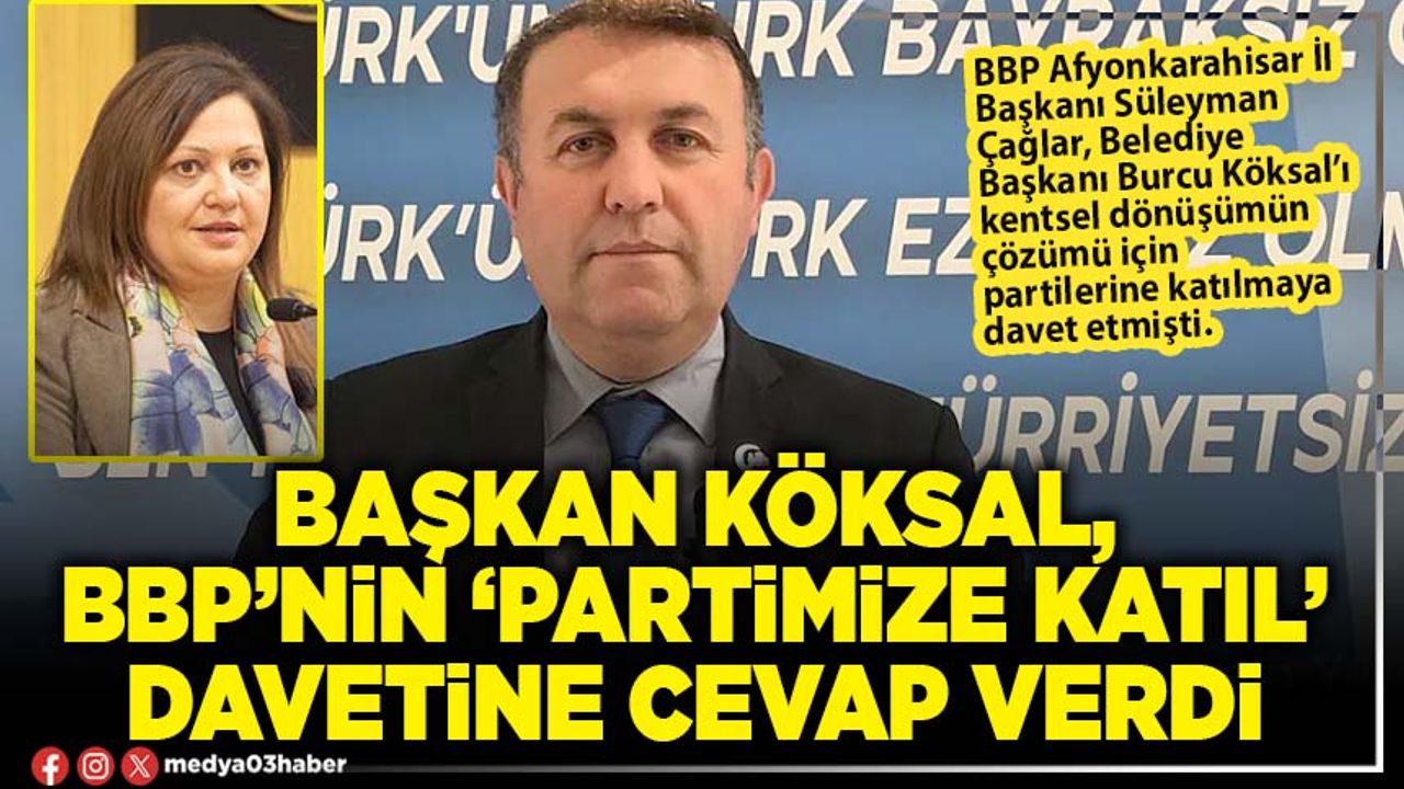 BBP İl Başkanı Süleyman Çağlar geçtiğimiz günlerde düzenlediği basın toplantısında Afyonkarahisar Belediye Başkanı Burcu Köksal’ı kentsel dönüşümün çözümü konusunda partilerine katılmaya davet etmiş, Medya03 Canlı Yayınında bu davetini tekrarlamıştı.