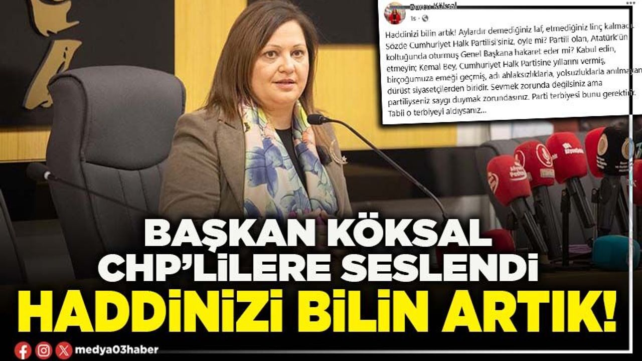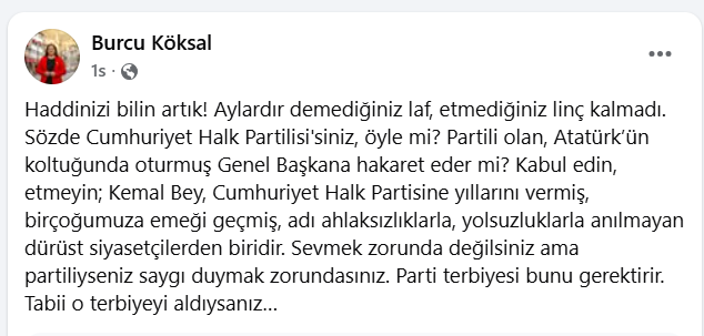 Afyonkarahisar Belediye Başkanı Burcu Köksal sosyal medya hesabından yine sert bir paylaşımda bulundu. Önceki dönem Genel Başkan Kemal Kılıçdaroğlu’na yönelik yapılan eleştirilere tepki gösteren Başkan Köksal paylaşımında şunları söyledi: “Haddinizi bilin artık! Aylardır demediğiniz laf, etmediğiniz linç kalmadı. Sözde Cumhuriyet Halk Partilisi'siniz, öyle mi? Partili olan, Atatürk’ün koltuğunda oturmuş Genel Başkana hakaret eder mi? Kabul edin, etmeyin; Kemal Bey, Cumhuriyet Halk Partisine yıllarını vermiş, birçoğumuza emeği geçmiş, adı ahlaksızlıklarla, yolsuzluklarla anılmayan dürüst siyasetçilerden biridir. Sevmek zorunda değilsiniz ama partiliyseniz saygı duymak zorundasınız. Parti terbiyesi bunu gerektirir. Tabii o terbiyeyi aldıysanız…” ifadelerini kullandı.