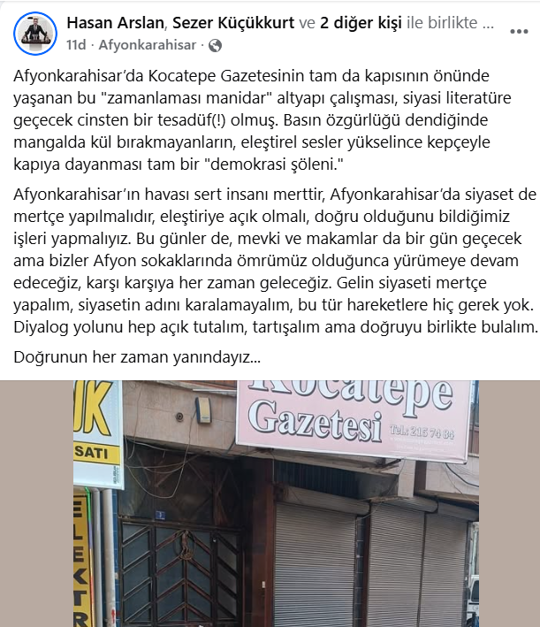 Konuyla ilgili AK Parti Milletvekili Dr.Hasan Arslan şu paylaşımı yaptı: “Afyonkarahisar’da Kocatepe Gazetesinin tam da kapısının önünde yaşanan bu "zamanlaması manidar" altyapı çalışması, siyasi literatüre geçecek cinsten bir tesadüf(!) olmuş. Basın özgürlüğü dendiğinde mangalda kül bırakmayanların, eleştirel sesler yükselince kepçeyle kapıya dayanması tam bir "demokrasi şöleni."