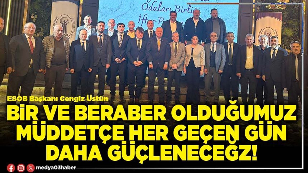İlahi ve duaların okunduğu iftar programında konuşmasına 800 yıllık ahi teşkilatının kıymetli temsilcileri diyerek başlayan ESOB Başkanı Cengiz Üstün şunları söyledi: “Ramazan sevgidir, samiyettir, paylaşımdır. Bizler; birbirimize tebessüm etmeyi unutmadan, birbirimizi kırmadan, saygı ve hoşgörü göstererek bu kutsal ayın gerçek amacına ulaşmasını sağlayabiliriz. Unutmayalım ki! birlik ve beraberlik içerisinde olduğumuz müddetçe her geçen gün daha güçleneceğiz.