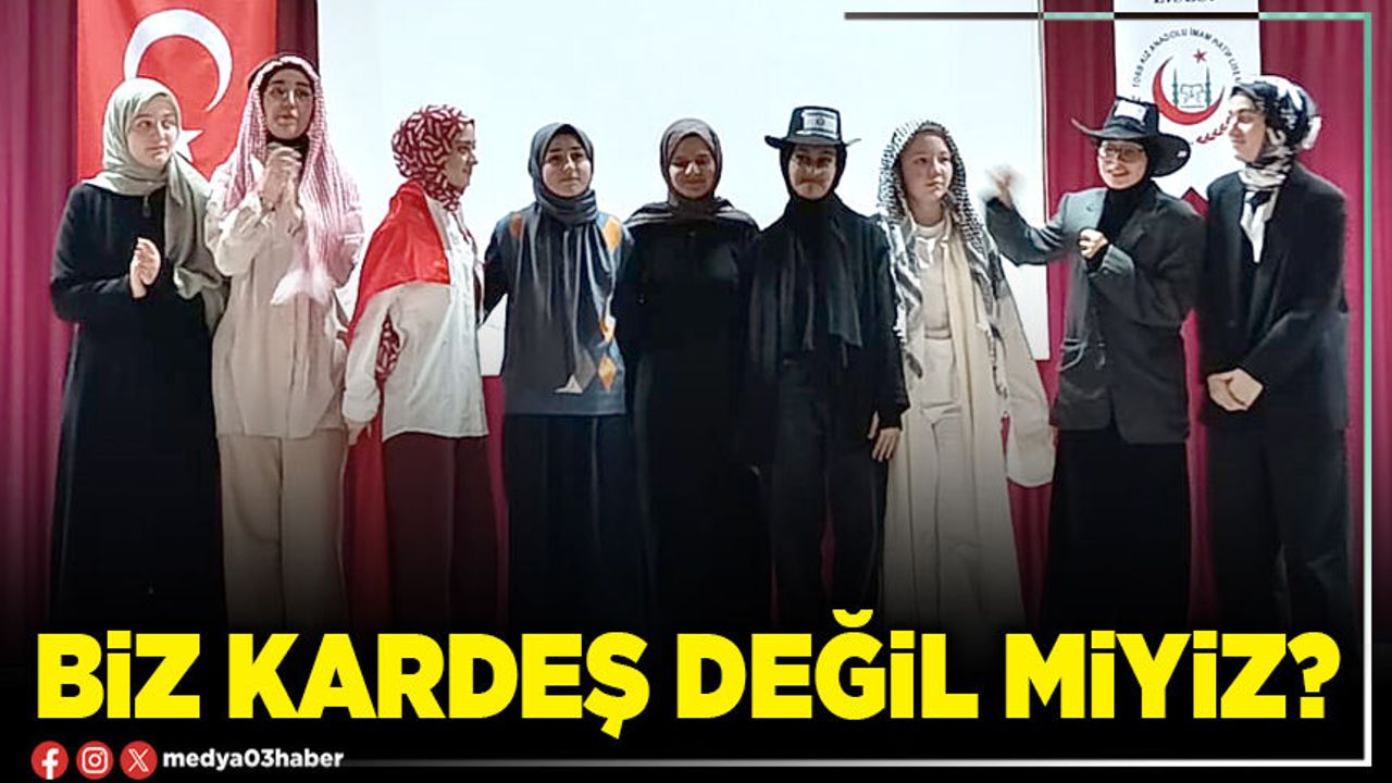 Okulun Çevreme Duyarlıyım, Değerlerime Sahip Çıkıyorum Projesi Koordinatör öğretmeni tarafından hazırlanan ve 13 kişilik yetenekli bir öğrenci ekibinden oluşan tiyatro grubu, "Biz Kardeş Değil miyiz?" adlı oyunlarını sergilemek üzere TOBB Kız Anadolu İmam Hatip Lisesinin konuğu oldu.