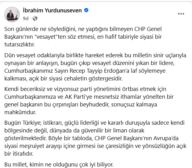 Bugün Türkiye; istikrarı, güçlü liderliği ve kararlı duruşuyla sadece kendi bölgesinde değil, dünyada da güvenilir bir liman olarak gösterilmektedir. Böyle bir tabloda, CHP Genel Başkanı’nın Avrupa’da siyasi meşruiyet arayışı içine girmesi ise çaresizliğin ve yönsüzlüğün açık bir itirafıdır.