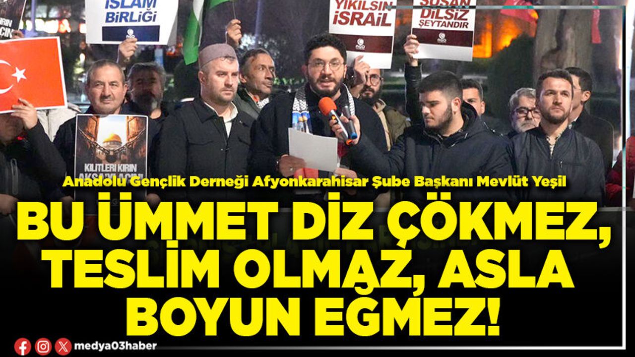 Ama biz buradan haykırıyoruz! Bu ümmet diz çökmez! Bu ümmet teslim olmaz! Bu ümmet asla boyun eğmez!
