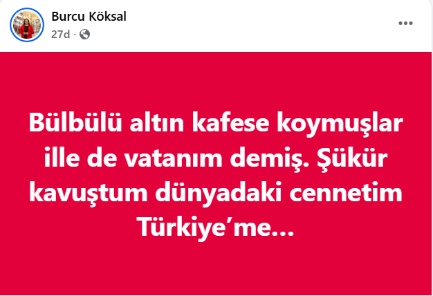 Yurda dönen Başkan sosyal sosyal medya hesabından şu paylaşımı yaptı: “Bülbülü altın kafese koymuşlar ille de vatanım demiş. Şükür kavuştum dünyadaki cennetim Türkiye’me…” ifadelerini kullandı.