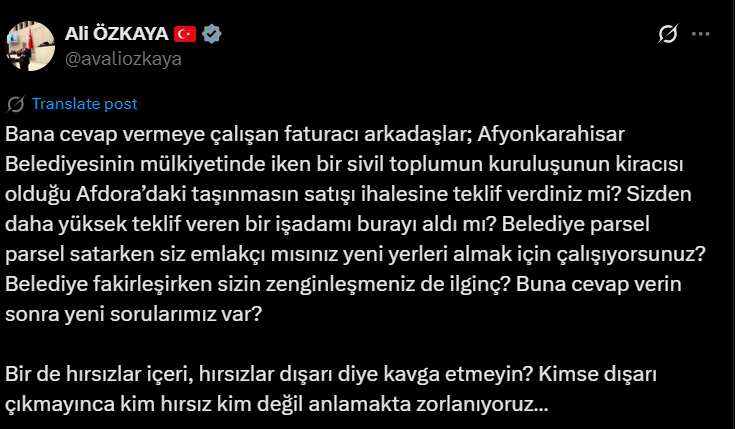 X hesabından bir paylaşım yapan AK Parti Milletvekili Av.Ali Özkaya şunları söyledi: “Bana cevap vermeye çalışan faturacı arkadaşlar; Afyonkarahisar Belediyesinin mülkiyetinde iken bir sivil toplumun kuruluşunun kiracısı olduğu Afdora’daki taşınmasın satışı ihalesine teklif verdiniz mi? Sizden daha yüksek teklif veren bir işadamı burayı aldı mı? Belediye parsel parsel satarken siz emlakçı mısınız yeni yerleri almak için çalışıyorsunuz? Belediye fakirleşirken sizin zenginleşmeniz de ilginç? Buna cevap verin sonra yeni sorularımız var?