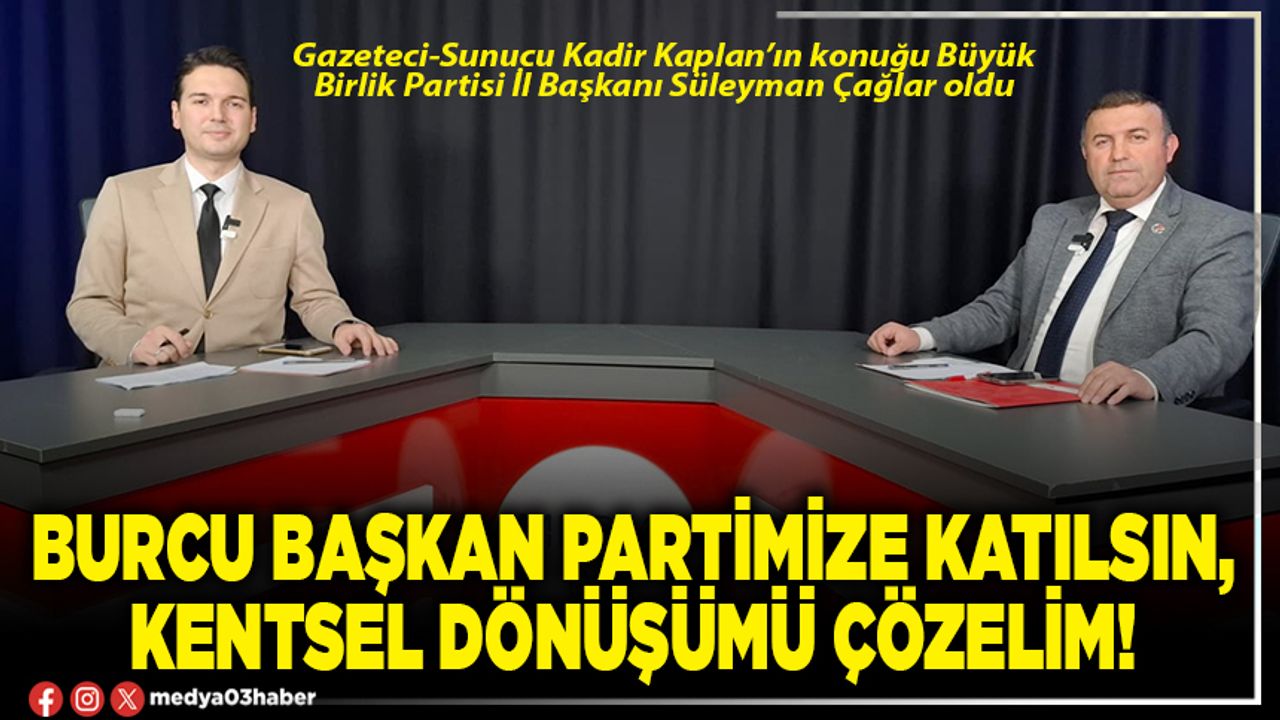 Afyon ölçeğinde kentsel dönüşümün en önemli konu olduğunu düşünüyorum. Deprem olduğunda bunu hatırlıyoruz, aklımıza geliyor. Deprem bitince unutuyoruz. Ekonomiden de, terörden de önemli. Çünkü deprem öldürmüyor, binalar öldürüyor. Bunu Hatay'da bizzat gördük. Bu sebeple Afyon’da bu mesele tıkandı.Burcu hanım bunu aşma noktasında çok başarılı olamadı. Yerel seçimler öncesi bunun sözünü verdi ama topu şimdi Bakanlığa atıyorlar. Bakanlıktan yetki beklediğini söylediler. Biz de Büyük Birlik Partisi olarak yapıcı, yol gösterici siyaset anlayışımız gereği bu tıkanıklığı açalım diyoruz. Burcu hanıma buradan sizlerin aracılığıyla tekrar edeyim. Burcu hanım Büyük Birlik Partisiyle yol yürürse biz bu tıkanıklığı aşağımızı biliyoruz. Gücümüzün farkındayız. Çevre Şehircilik Bakanlığı ile alakalı sıkıntıyı giderelim, oradaki mağduriyeti giderelim, Burcu hanım yine kendi partisine geri dönsün. Bizim buradaki derdimiz üzüm yemek, bağcıyı dövmek değil.”
