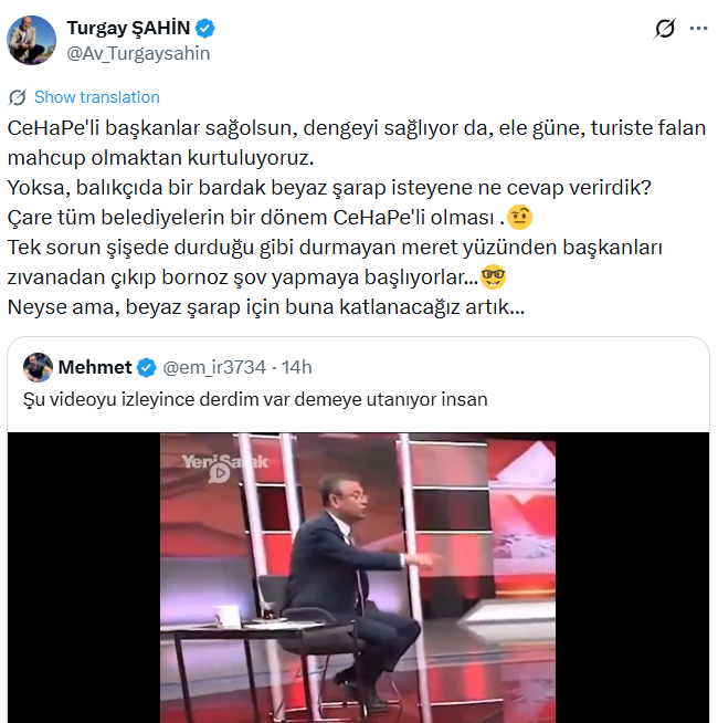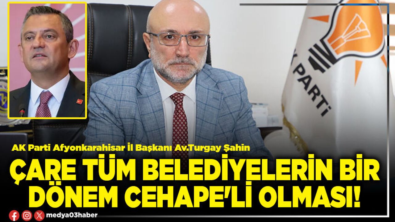 CHP Genel Başkanı Özgür Özel’in katıldığı bir televizyon programında yaptığı videoyu X hesabından paylaşan AK Parti Afyonkarahisar İl Başkanı Av.Turgay Şahin şunları söyledi: “CeHaPe'li başkanlar sağolsun, dengeyi sağlıyor da, ele güne, turiste falan mahcup olmaktan kurtuluyoruz. Yoksa, balıkçıda bir bardak beyaz şarap isteyene ne cevap verirdik? Çare tüm belediyelerin bir dönem CeHaPe'li olması Tek sorun şişede durduğu gibi durmayan meret yüzünden başkanları zıvanadan çıkıp bornoz şov yapmaya başlıyorlar... Neyse ama, beyaz şarap için buna katlanacağız artık...” ifadelerini kullandı.