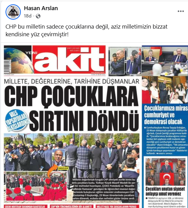 Gaziantep’te düzenlenen 23 Nisan Ulusal Egemenlik ve Çocuk Bayramı törenlerinde CHP grubu, Mehter Marşı söyleyen çocuk mehteran takımına sırtını dönerek tepki göstermiş, CHP Gaziantep İl Başkanı Vakkas Acar, "Çocuklarımızın hala saray kültürüne özendirilmesini protesto ediyoruz" demişti.