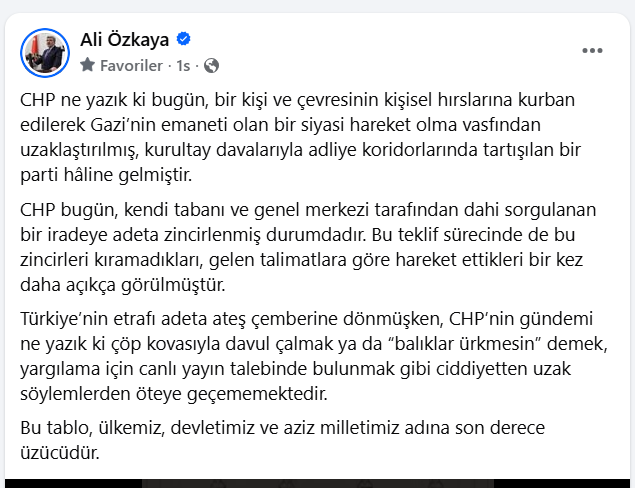 AK Parti Afyonkarahisar Milletvekili Av.Ali Özkaya, TBMM’de CHP’nin genel görüşme açılmasına dair önergesi üzerine söz aldı. Sosyal medya hesabından konuşma videosunu yayınlayan Özkaya paylaşımında şunları söyledi: “CHP ne yazık ki bugün, bir kişi ve çevresinin kişisel hırslarına kurban edilerek Gazi’nin emaneti olan bir siyasi hareket olma vasfından uzaklaştırılmış, kurultay davalarıyla adliye koridorlarında tartışılan bir parti hâline gelmiştir.
