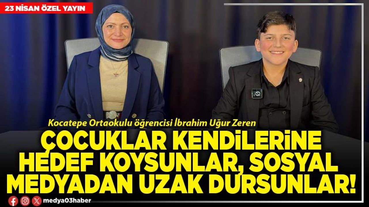 Afyonkarahisar’da birbirinden başarılı öğrenciler 23 Nisan Ulusal Egemenlik ve Çocuk Bayramı nedeniyle Medya03’de düzenlenen “Geleceğin Mimarları” özel yayının konuğu oldu. Rasime Fedakar’ın moderatörlüğünde gerçekleşen programa konuk olan Kocatepe Ortaokulu öğrencisi İbrahim Uğur Zeren, hayallerini ve 23 Nisan’ın kendisi için ne anlam ifade ettiğini anlattı.