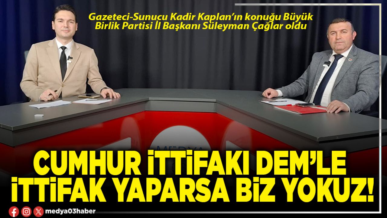 Cumhur ittifakının DEM’le ittifak etmesi halinde kendilerinin o ittifakta olmayacağını söyleyen Çağlar, “Önümüzdeki seçimlerde 2027-2028’de AK Parti, Milliyetçi Hareket Partisi, DEM Parti seçim ittifakı yapacağız dediler, biz yokuz orada.”