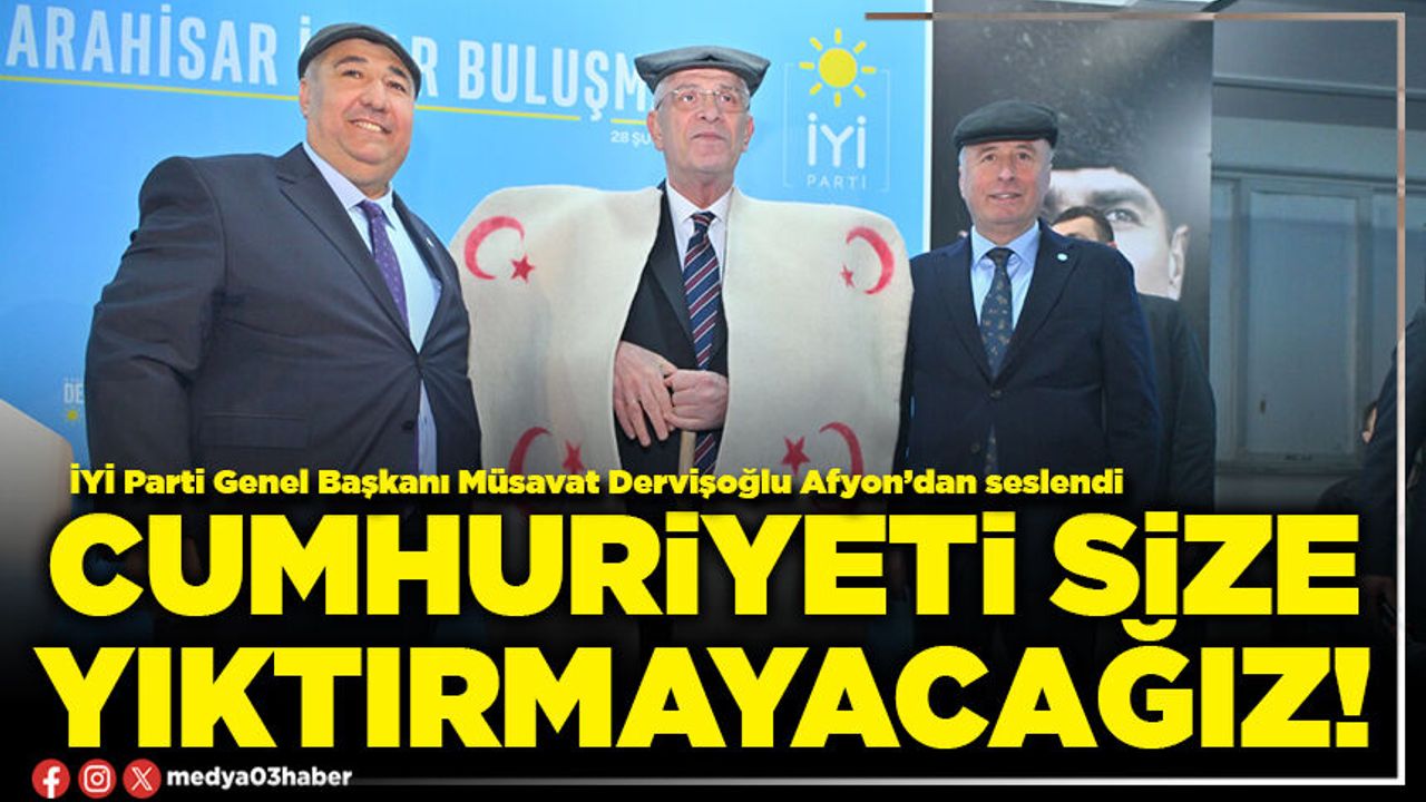 Afyonkarahisar’dan tüm Türkiye’ye seslendiğini belirten Dervişoğlu, “Zaferin tetiklendiği, ilk hedefin Akdeniz emrinin verildiği yerden sesleniyorum: Cumhuriyeti size yıktırmayacağız” sözleriyle konuşmasının en dikkat çeken mesajını verdi. Türkiye’nin kolay lokma olmadığını belirten Dervişoğlu, milletin birlik içinde olduğu sürece hiçbir gücün Türkiye’yi zayıflatamayacağını ifade etti.