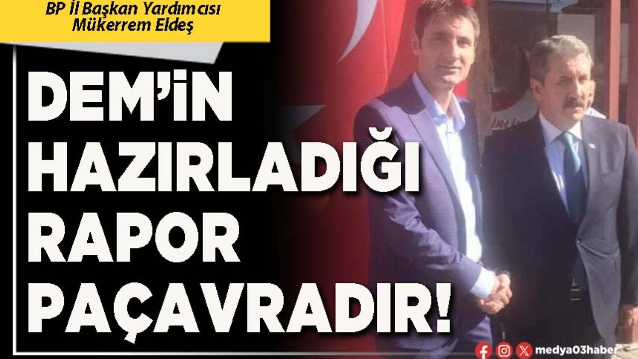 TBMM’ye DEM Partisi tarafından sunulan çözüm raporuyla ilgili yazılı açıklama yapan Büyük Birlik Partisi Afyonkarahisar İl Başkan Yardımcısı Mükerrem Eldeş şunları söyledi: "Adına kardeşlik süreci denilen süreç çerçevesinde Mecliste kurulan komisyon üzerinden bazı partiler meclise raporlar sunmaya başladılar. Bu çerçevede PKK'nın meclisteki uzantısı olan DEM Partisi de ne yazık ki Gazi Meclisimize 99 sayfalık sözde bir rapor sunmuş.
