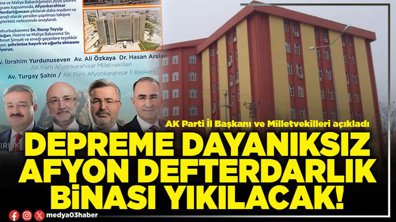 AK Parti Afyonkarahisar Milletvekili Dr. Hasan Arslan ise değerlendirmesinde, 2026 Yılı Kamu Yatırım Programı’nın AK Parti’nin eser ve hizmet siyasetinin somut bir göstergesi olduğunu ifade ederek, “Teknik incelemelerde depreme dayanıksız olduğu tespit edilen Defterdarlık Hizmet Binası’nın yıkılarak yeniden yapılması, insan odaklı ve güvenli şehir anlayışımızın bir sonucudur. Afyonkarahisar’ımıza daha sağlam ve modern kamu binaları kazandırılmaya devam ediliyor” açıklamasında bulundu.