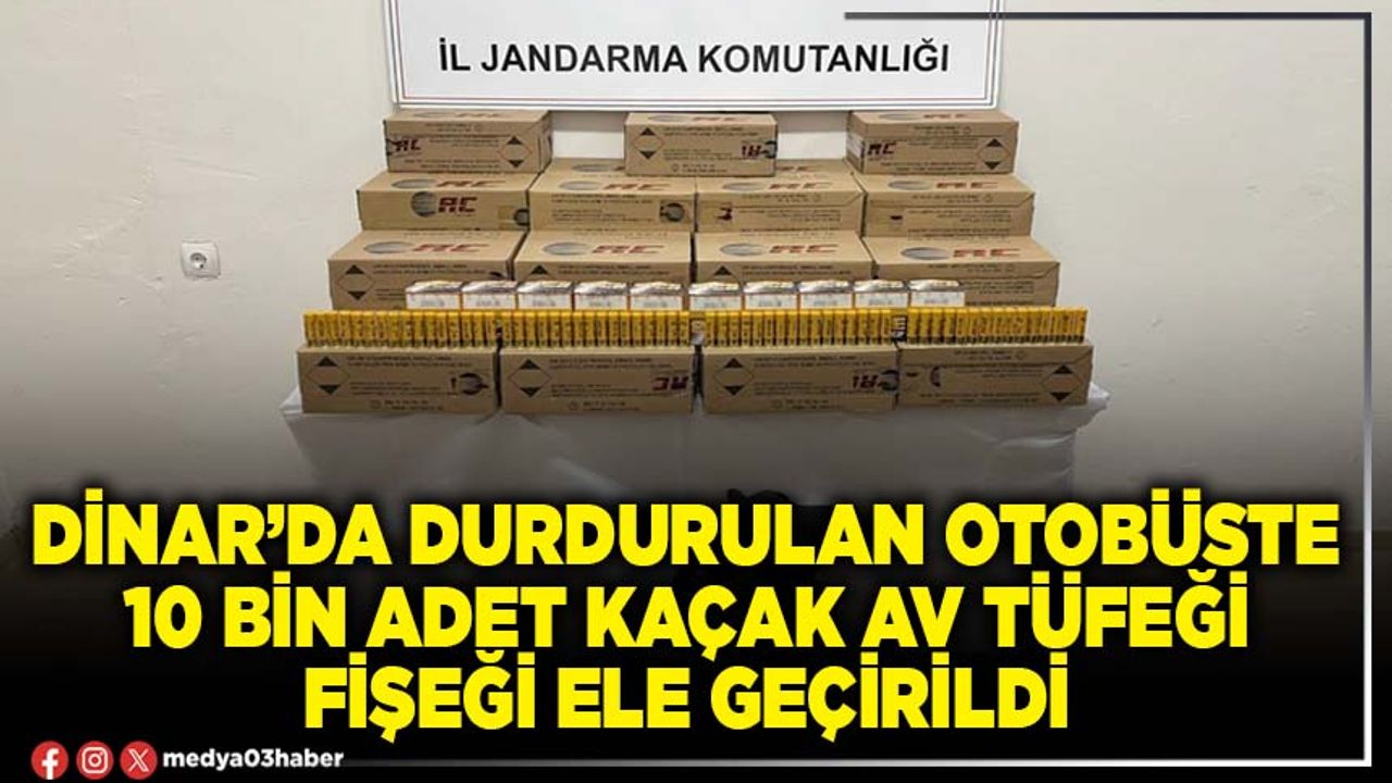 Edinilen bilgilere göre; Afyonkarahisar İl Jandarma Komutanlığı ekipleri Dinar ilçesinde, İzmir’den Konya’ya gitmekte olan yolcu otobüsünde yaptıkları aramada (10.000) Adet kaçak av tüfeği fişeği ele geçirdi.