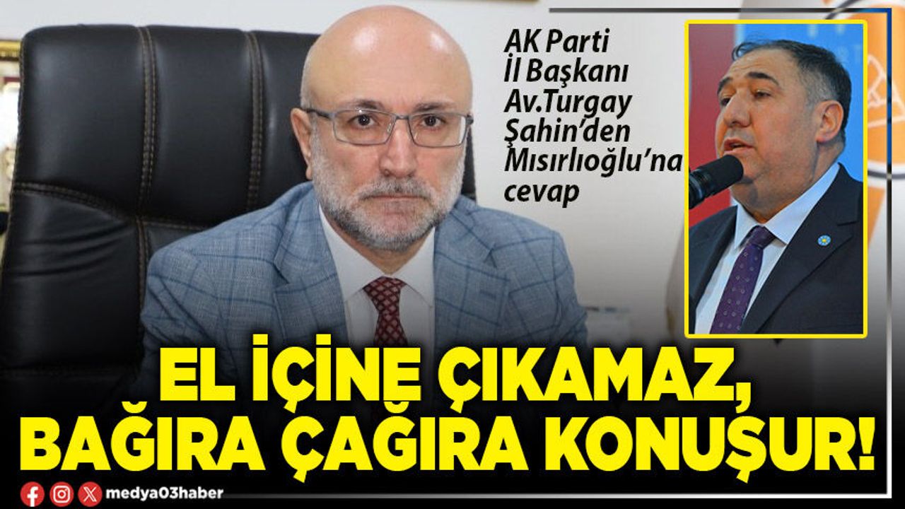 AK Parti İl Başkanı Av.Turgay Şahin, Mısırlıoğlu’na cevaben şunları söyledi: “Kendisi el içine çıkamaz, Ortalıkta gözükmez Basın açıklaması dışında gören yoktur Onda da stadyum dolusu insana hitap ediyormuş gibi bağıra çağıra konuşur. Bizim esnaf ziyaretlerimize takmış şimdi de... Beraber gezelim diyor... İyi de esnaf, dükkânının bereketini kaçıracak bir adamı ister mi bakalım? Hadi başka kapıya... Not: cevabınızı özlemle bekliyorum.” ifadelerine kullandı.