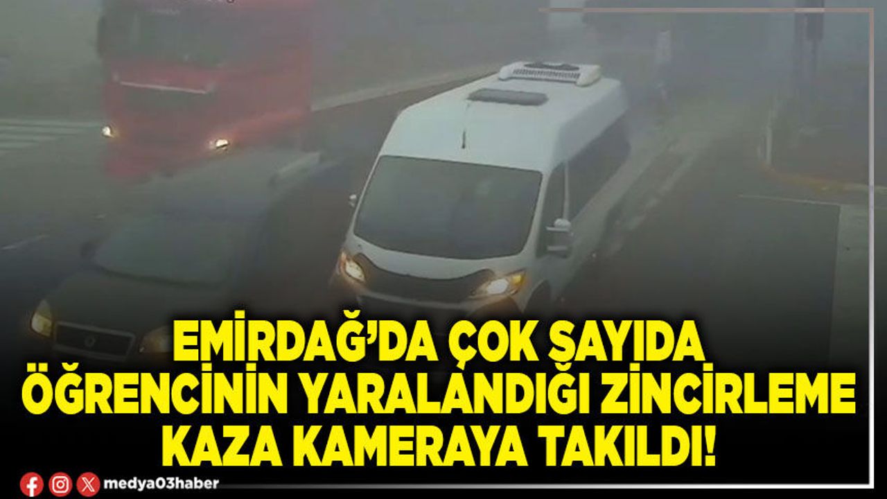 Emirdağ ilçesi Karacalar Kavşağı'nda sabah erken saatlerde öğrenci servisi, tır ve hafif ticari aracın karıştığı trafik kazasında 20 kişi yaralanmıştı. Yaralılardan 5'inin ayakta tedavi edildiği kazanın güvenlik kamerasına yansıyan görüntüleri ortaya çıktı. Görüntülerde kırmızı ışıkta bekleyen öğrenci servisine arkadan gelen tırın çarptığı, ardından savrulan servis aracının ise önündeki hafif ticari araca çarptığı görüldü. Görüntüler, facianın ucuz atlatıldığını gözler önüne serdi.