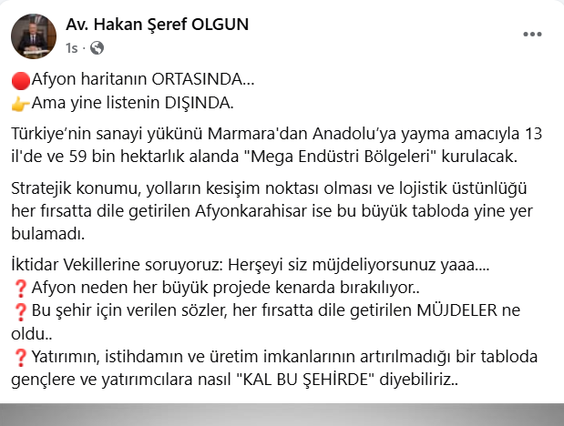 Konuyla ilgili İYİ Parti Afyonkarahisar Milletvekili Av.Hakan Şeref Olgun şu paylaşımı yaptı: