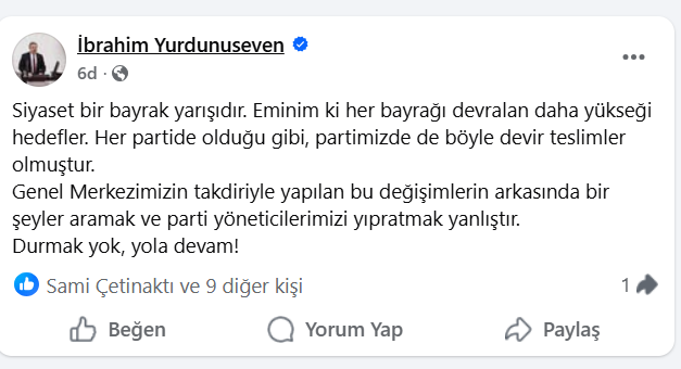 Dün akşam ortaya atılan AK Parti Afyonkarahisar’da Merkez İlçe Başkanı Serkan Mumyakmaz ile İhsaniye İlçe Başkanı Mustafa Özer’in görevden alındıkları iddiasını isim vermeden AK Parti Milletvekili Av.İbrahim Yurdunuseven doğruladı. Sosyal medya hesabından bir paylaşım yapan Milletvekili Yurdunuseven, “Siyaset bir bayrak yarışıdır. Eminim ki, her bayrağı devralan daha yükseği hedefler. Her partide olduğu gibi partimizde de böyle devir teslimler olmuştur. Genel Merkezimizin takdiri ile yapılan bu değişimlerin arkasında bir şeyler aramak ve parti yöneticilerimizi yıpratmak yanlıştır. Durmak yok , yola devam!” dedi.
