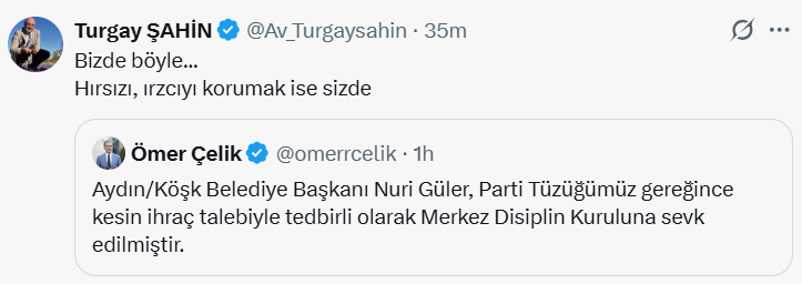 AK Parti Genel Merkezi, hakkında ortaya atılan iddialar ve basında çıkan haber nedeniyle Aydın/Köşk Belediye Başkanı Nuri Güler’i kesin ihraç talebiyle tedbirli olarak Merkez Disiplin Kuruluna sevk etti. Bu kararı sayfasında paylaşan AK Parti İl Başkanı Av.Turgay Şahin’den CHP’ye gönderme geldi. Başkan Şahin, “Bizde böyle... Hırsızı, ırzcıyı korumak ise sizde.” dedi.