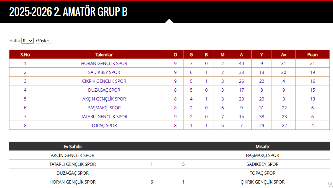 Öte yandan grupta deplasmanda Tatarlı Gençlikspor'u 5-1 mağlup eden Sadıkbeyspor haftayı puan cetvelinde 2. sırada tamamlayarak zirve yarışını sürdürdü.