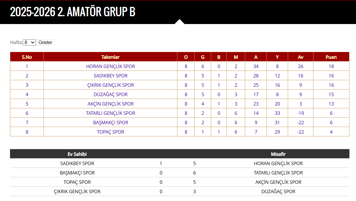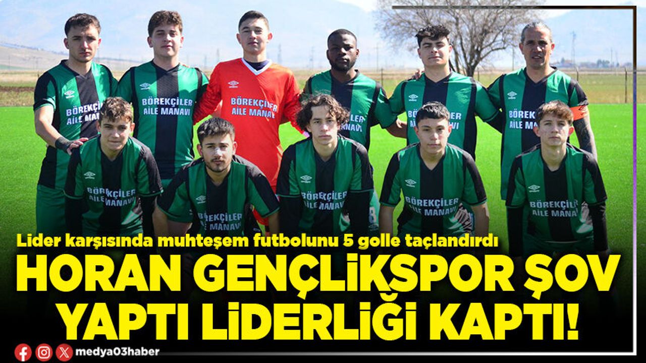 2. Amatör Lig B grubunda Horan Gençlikspor son haftalardaki yükselişiyle dikkatleri üzerine çekmeyi başardı. Teknik Direktörlüğünü İbrahim Akbal’ın yaptığı Horan Gençlikspor bugün deplasmanda lider Sadıkbeyspor’a konuk oldu. Rakibi karşısında baştan sona üstün oynayan Horan Gençlikspor rakibini Furkan Karaman, Furkan Aykın, Bayram Emre Ünal, Harun Kayıkçı VE Veysel Dalkıç’ın golleriyle 5-1 mağlup ederek hem lider Sadıkbeyspor’u farklı mağlup etti, hem de liderlik koltuğuna oturdu.