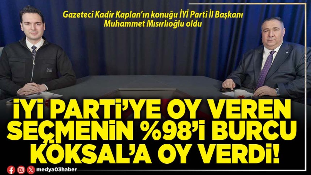 İYİ Parti seçmenin Belediye Başkanlığı seçiminde stratejik oy kullandığını ve seçmenin %98’inin Burcu Köksal’a oy verdiğini söyleyen Başkan Mısırlıoğlu, “Afyonkarahisar'da siyaset seçimden sonra bitmeli. Seçilenler seçildiği gün parti rozetlerini bir kenara bırakıp Türkiye Cumhuriyeti Devletinin ay yıldızlı bayrağını rozet olarak yakalarına takmalı. Ve O günden itibaren Belediye Başkanıysa tüm şehrin Belediye Başkanı, milletvekili ise tüm şehrin Milletvekili olmalı. Hizmet için hep bir araya gelerek kollektif çalışma yürütülmeli. Bugün Belediye Başkanımız Cumhuriyet Halk Partili. Benim de başımda bulunduğum İYİ Parti'nin seçmeninin %98’i oy verdi. Partililerimiz arasında yaptığımız anketlerde geçtiğimiz seçimde İYİ Parti'ye oy veren seçmenin %98’i Köksal'a oy verdi. Bizim seçmenimiz bilinçli ve akıllı. İYİ Parti'nin seçmeni sorguluyor, araştırıyor, O’na göre oy veriyor. Stratejik oy kullandılar ve muhalif adayın kazanmasını istediler. Yeni bir sayfa açılmasını istediler ve yeni bir sayfa açıldı.”