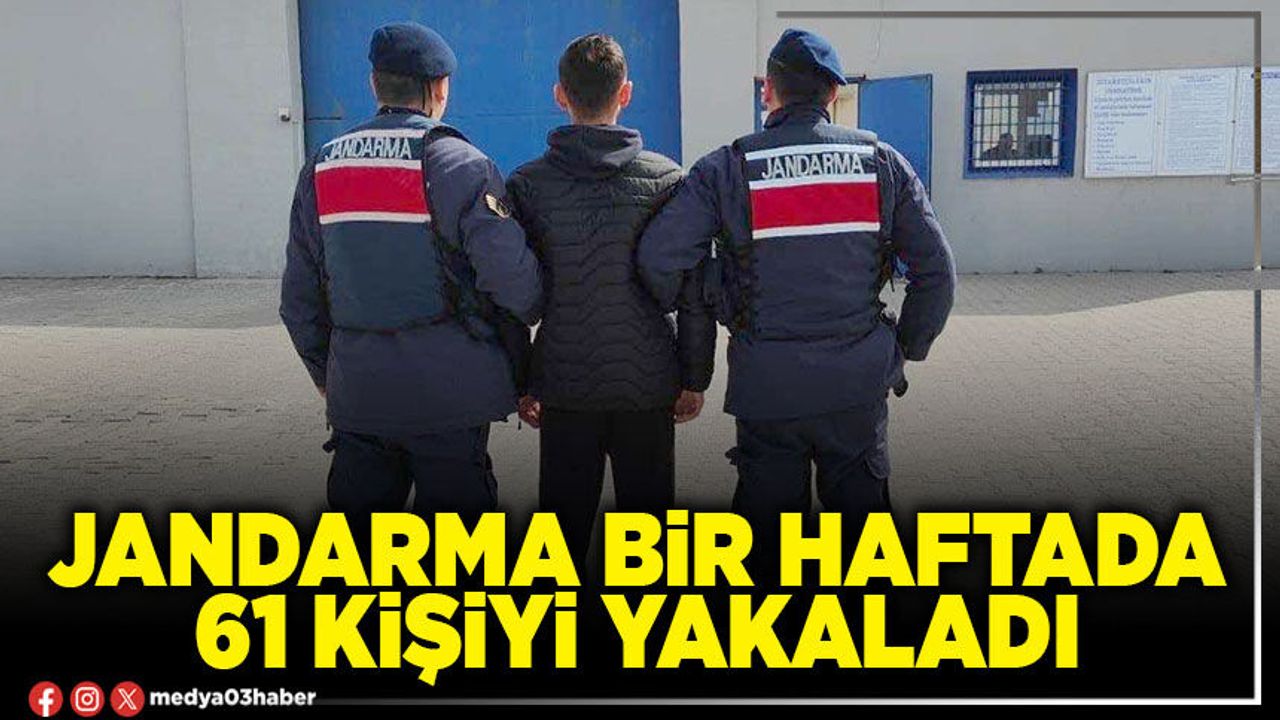 Edinilen bilgilere göre; Afyonkarahisar İl Jandarma Komutanlığı ekipleri son bir hafta içerisinde öldürme suçundan 1, siber suçlardan 1, kaçakçılık suçundan 2, narkotik suçlardan 8, dolandırıcılık suçundan 8, hırsızlık suçlarından 7 ve diğer suçlardan 34 şahıs olmak üzere toplam 61 şahsı yakaladı.