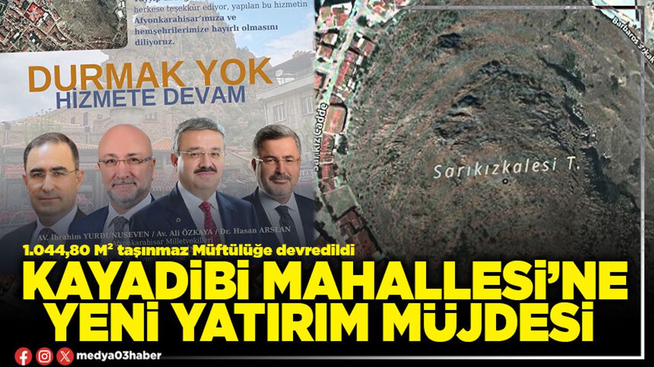 Yürütülen çalışmalar sonucunda Afyonkarahisar Merkez Kayadibi Mahallesi’nde hazine adına tescilli ve Gençlik ve Spor Bakanlığı’na tahsisli 1.044,80 metrekare büyüklüğündeki taşınmazın, Afyonkarahisar Müftülüğüne devri gerçekleştirildi. AK Parti heyetinin girişimleriyle gerçekleştirilen bu tahsis, bölgenin sosyal ve manevi ihtiyaçlarına katkı sağlayacak önemli bir yatırım olarak değerlendiriliyor.