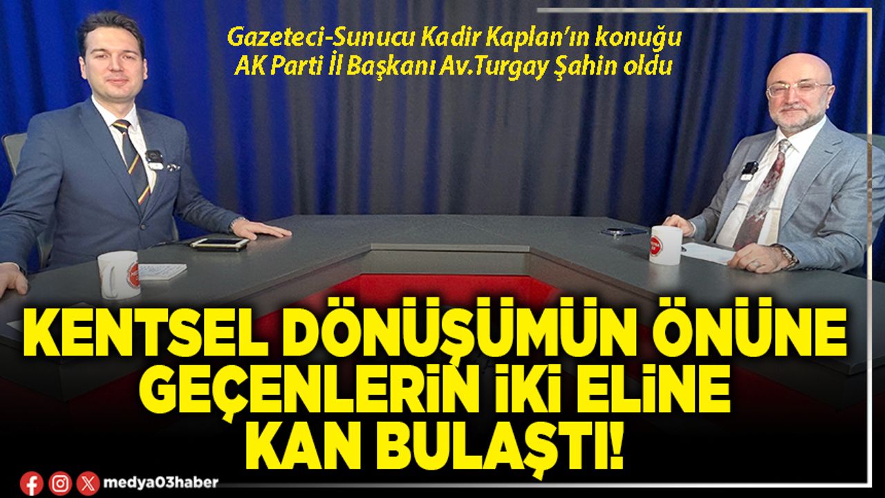AK Parti İl Başkanı Av.Turgay Şahin, Medya03’de ‘Siyaset Dünyası’ programında Gazeteci-Sunucu Kadir Kaplan’ın sorularını yanıtladı. Başkan Şahin, son günlerde yeniden tartışma konusu olan CHP ile AK Parti’yi karşı karşıya getiren Kentsel dönüşüm konusuyla ilgili önemli açıklamalarda bulundu.