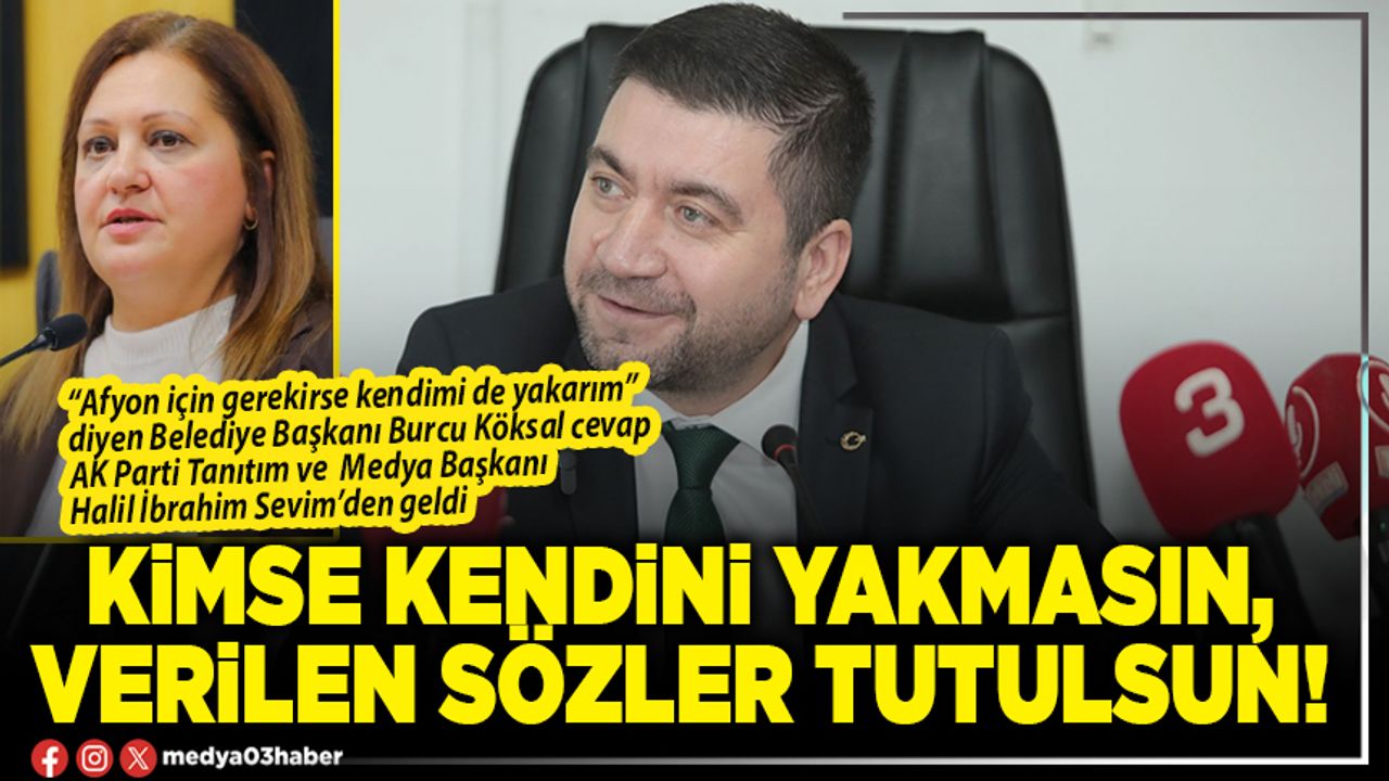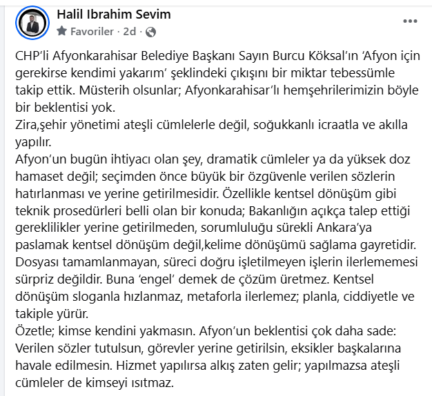 Konuyla ilgili sosyal medya hesabından bir paylaşım yapan AK Parti Tanıtım ve Medya Başkanı Halil İbrahim Sevim şunları söyledi: “CHP’li Afyonkarahisar Belediye Başkanı Sayın Burcu Köksal’ın ‘Afyon için gerekirse kendimi yakarım’ şeklindeki çıkışını bir miktar tebessümle takip ettik. Müsterih olsunlar; Afyonkarahisar’lı hemşehrilerimizin böyle bir beklentisi yok.