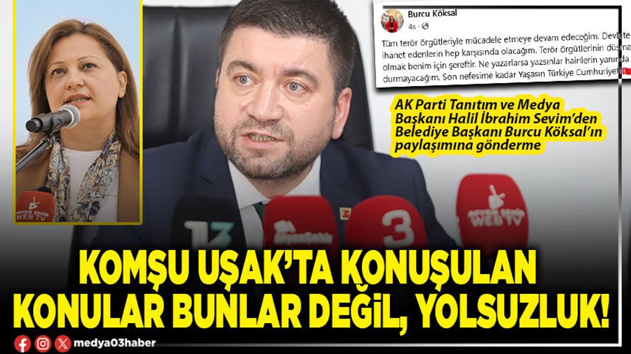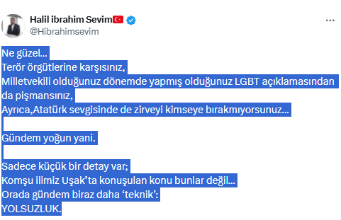 Başkan Köksal’ın paylaşımına isim vermeden göndermede bulunan AK Parti Tanıtım ve Medya Başkanı Halil İbrahim Sevim’den şu paylaşım geldi: “Ne güzel… Terör örgütlerine karşısınız, Milletvekili olduğunuz dönemde yapmış olduğunuz LGBT açıklamasından da pişmansınız, Ayrıca, Atatürk sevgisinde de zirveyi kimseye bırakmıyorsunuz… Gündem yoğun yani. Sadece küçük bir detay var; Komşu ilimiz Uşak’ta konuşulan konu bunlar değil… Orada gündem biraz daha ‘teknik’: YOLSUZLUK.” ifadelerini kullandı.