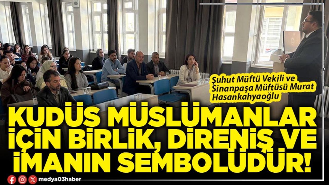 Şuhut ilçesinde gerçekleşen "İlk Kıblemiz Mescid-i Aksa" konulu konferansta konuşan Şuhut Müftü Vekili ve Sinanpaşa Müftüsü Murat Hasankahyaoğlu tarih boyunca Kudüs’ün Müslümanlar için birliğin, direnişin ve imanın sembolü olduğunu belirtti.