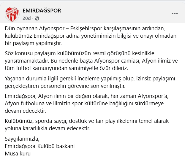 Emirdağspor Kulübü’nden kamuoyuna yapılan açıklamada şu ifadelere yer verildi: “Dün oynanan Afyonspor – Eskişehirspor karşılaşmasının ardından, kulübümüz Emirdağspor adına yönetimimizin bilgisi ve onayı olmadan bir paylaşım yapılmıştır.