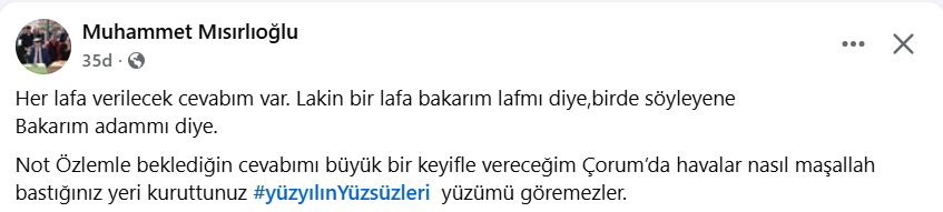 İYİ Parti İl Başkanı Muhammet Mısırlıoğlu’nun AK Parti İl Başkanı Av.Turgay Şahin’e yönelik verdiği cevap şöyle: “Her lafa verilecek cevabım var. Lakin bir lafa bakarım lafmı diye, birde söyleyene bakarım adam mı diye. Not: Özlemle beklediğin cevabımı büyük bir keyifle vereceğim Çorum’da havalar nasıl maşallah bastığınız yeri kuruttunuz #yüzyılınYüzsüzleri yüzümü göremezler.” ifadelerini kullandı.
